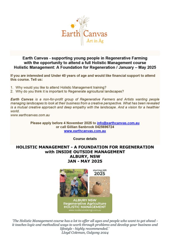 Please apply before 4 November 2025 to info@earthcanvas.com.au or call Gillian Sanbrook 0425696724